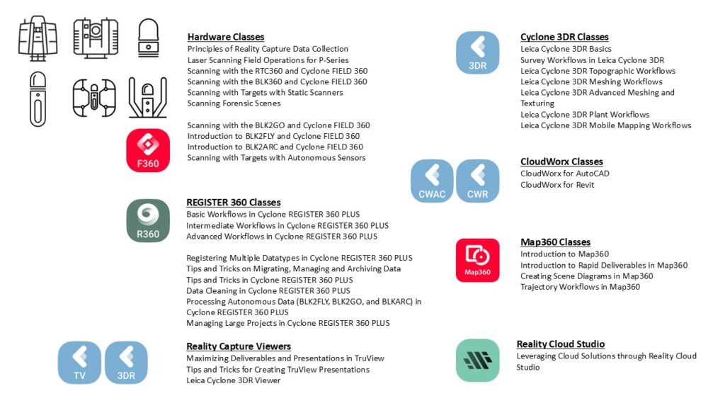 The following lists the virtual classes offered and they are organized by Hardware and Software. The classes are rotated monthly. Not all classes are offered each month. If a certain class is not offered one month, please reach out to rc.training.geo@leica-geosystems.com and the team will do their best to offer it in the next virtual training week.